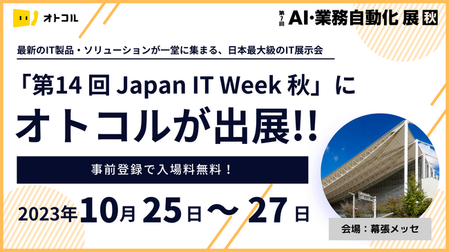 アイザック株式会社(本社:東京都渋谷区、代表取締役社長 田中 和希)は、2023年10月25日(水)~27日(金)に開催される最新のIT製品・ソリューションが一堂に集まる、日本最大級のIT展示会「第14 回 Japan IT Week 秋」に出展します。展示ブースでは、電話発信業務を自動化する「オトコル」をご覧いただけます。