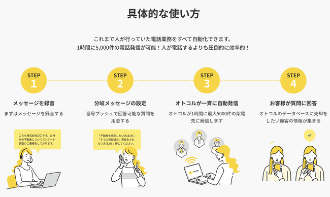 オトコルは、これまで人力で行っていた電話業務を自動化することによって、電話工数や心理的負担を軽減できるサービスです。電話業務を効率化したいと考えていたり、本当は電話をした方が良いけど、メールだけで済ましてしまっていたりする方々に、当社のサービスを知っていただきたいと思っています。少しでも当てはまるな、と感じる方はぜひお気軽にお立ち寄りください。