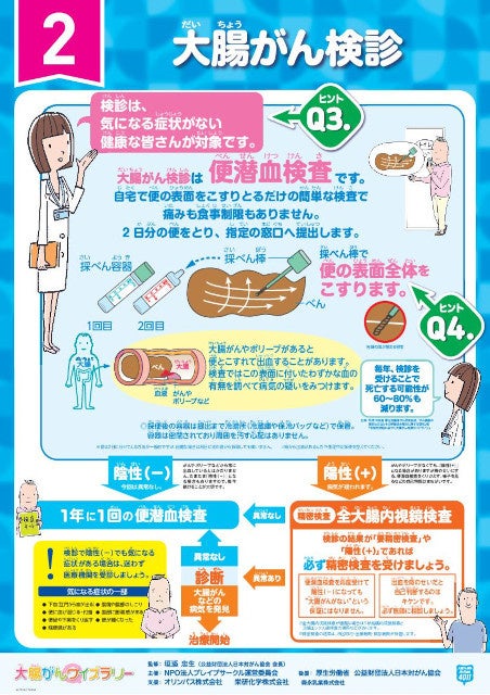 【登録目的】大腸がんは早期発見・早期治療で95%以上の人が治ると言われています。しかし現状では、がん死亡原因では、女性1位、男性第2位※となっています。早期発見のために40歳以上は年1回の大腸がん検診(便潜血検査)の受診が推奨されています。