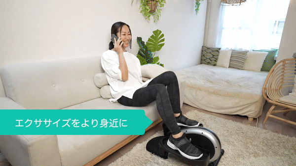 従来のエクササイズマシンに比べ、楕円モーションにより、こいだ際の膝が上がる高さが低くなるため、ソファ前、机下、オフィスのデスク下など、好きな場所でROOMBIKEを楽しめます。また非常に静音のため、働きながらROOMBIKEでエクササイズすることもオススメの使い方です。