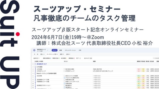 この度、株式会社スーツ(所在地:東京都千代田区、代表取締役社長CEO:小松 裕介)は、2024年6月7日(金)19時から、当社代表の小松が講師を務めるスーツアップ・セミナー「凡事徹底のチームのタスク管理」を無料開催します。