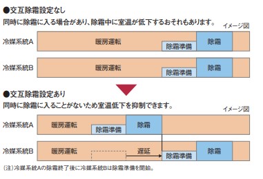 連絡配線(H-LINKII)に接続された2つの冷媒系統のうち、1つが除霜準備または除霜中の場合、除霜運転が終了するまでもう1つの冷媒系統は除霜運転を行わず、2つの冷媒系統が同時に除霜運転となることを防止します。同一フロアに2系統の空調システムがある場合に、室温低下を抑制できます。