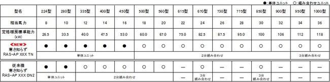 また、基本モジュール容量を8、10、12、14、16馬力に拡大し、最大36HPまで組み合わせ可能。従来型と比べて単体ユニットの容量を拡大したことで、コンパクトに設置することが可能となり、室外ユニット間の接続工事も不要となりました。
