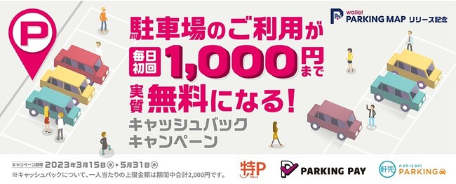 本キャンペーンは、「TOYOTA Wallet」内のミニアプリサービス「Wallet Parking Map」から駐車場をご利用いただくと、毎日初回利用分について1,000円まで実質無料になるキャッシュバックキャンペーンを実施します。