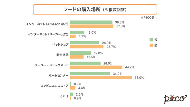ECサイトの普及により、フードの購入にも変化が。例えば、メーカー公式サイトで決まったフードを購入している猫のオーナーが4.7%に対して、犬のオーナーは12%と、猫オーナーの約2.5倍。その分猫オーナーはドラッグストアやホームセンターなどの実店舗でフードを購入している人が約50%と多く、犬の約30%とは差が開きました。