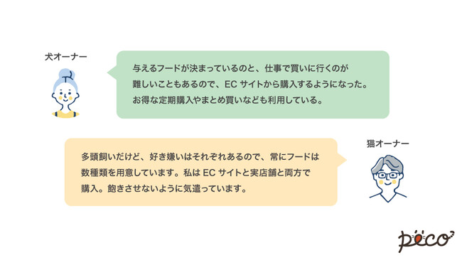 ここから見えてくるのは、決まったフードをできるだけ購入回数を減らしてまとめ買いをしたい犬オーナーと、実際に自分の目で見て、フードを選んでこまめに購入し猫に与えたいという猫オーナーの意識の違いです。