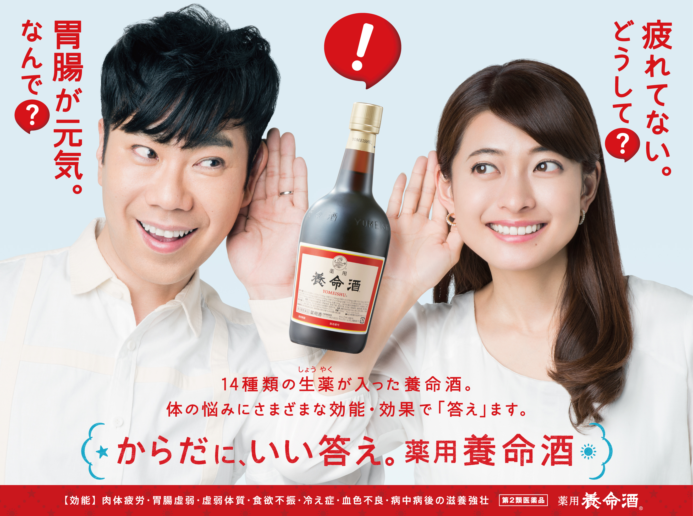 「疲れ」や「胃腸の不調」など、さまざまな症状に効く薬用養命酒。まるで体の悩みに答えるように、7つの効能・効果で『からだに、いい答え。』へと導きます。TVCMでは昨年に引き続き、藤井隆さん・乙葉さん夫妻が登場。おふたりが養命酒を介してテンポの良い会話をすることで、元気で明るい暮らしの真ん中に養命酒があることを表現しています。昨年から養命酒を飲み始めたふたりが『からだに、いい答え。』を実感しているストーリーになっていますので、ぜひご覧ください。