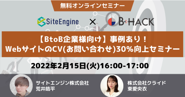 「改善のタネを広める」を経営理念としてWebマーケティング支援サービスを提供するサイトエンジン株式会社(本社:東京都世田谷区 代表取締役:毛塚智彦)は、2022年2月15日(火)16:00~17:00に、株式会社クライド(本社:東京都渋谷区 代表取締役社長:服部司)との共催セミナー”【BtoB企業様向け】事例あり!WebサイトのCV(お問い合わせ)30%向上セミナー”を開催します。