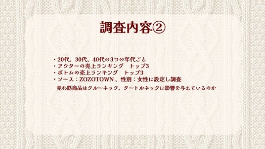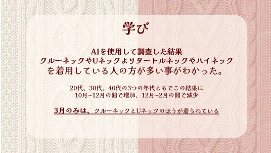大阪文化服装学院では毎年、半期に渡ってデータ分析の課題に取り組み、計3回の調査・発表をします。2回目、3回目になるとコツを掴み、明らかにクオリティが上がっていきます。