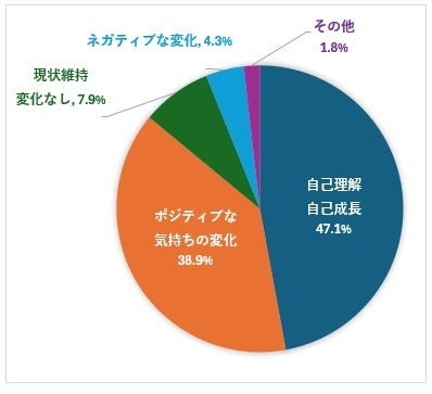 自由回答をまとめたところ、大きく5つの傾向に分類されました。その中で「自己理解・自己成長」が47.1% と最も高く、さらに38.9%の「ポジティブな気持ちの変化」も良い変化の一部と捉えると、全体の約8割ものユーザーがリザライでの活動を通じて、前向きな変化を実感していることが明らかになりました。