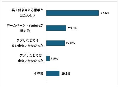次いで、「ホームページ・YouTubeが魅力的」が29.3%、「アプリなどでは良い出会いがなかった」が27.6%と続きました。