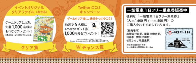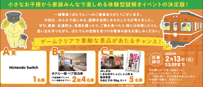 ゲームクリアし、アンケートに回答いただいた方には、Nintendo Switch(1名様)、ホテル一畑宿泊券(2組4名様)、JAしまね特産品(5名様)を抽選でプレゼント。また、ゲームクリア先着1,000名様には、イベントオリジナルクリアファイルをもれなくプレゼントいたします。(景品はなくなり次第終了)