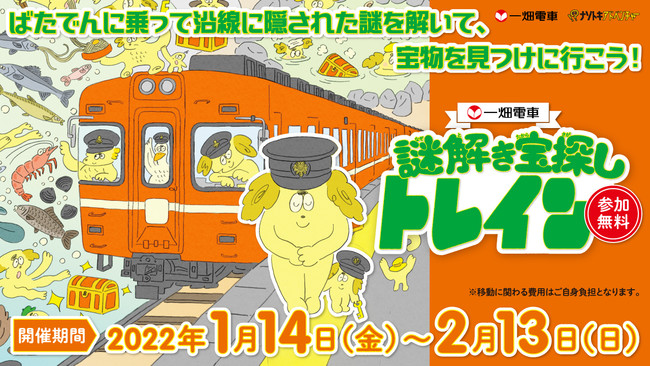一畑電車(本社:島根県出雲市平田町 代表取締役社長:福富茂人)では、2022年1月14日(金)より、観光庁による既存観光拠点再生・高付加価値化推進事業の補助金を活用し、以下のとおりのイベント「一畑電車 謎解き宝探しトレイン」を開催いたします。