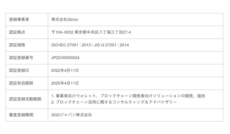 これまでGincoは、暗号資産ウォレット等のサービス提供にあたって情報セキュリティ体制の構築・向上をしてまいりました。今後より一層お客様に安心・安全にインフラサービスをご利用いただけるよう、組織的な情報管理・運用体制の強化のため、今回のISMS認証取得に至りました。