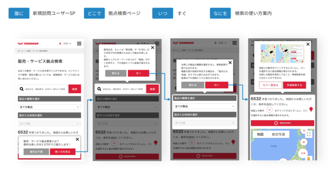 ヤンマーではインターネットに慣れていないお客様も多く、グローバル、全事業で6,000を超える販売・サービス拠点の検索方法を丁寧にご案内することは、Webサイトの重要な役割でもあります。検索方法を3ステップでご案内するシナリオを導入したところ、KPIとして設定した拠点の検索結果ページへの到達率がシナリオを実施していない場合と比べて、PCでは110%、スマートフォンでは111%に改善しました。