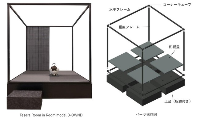 株式会社Tesera(本社:石川県金沢市/代表取締役社長:内田武彦、以下Tesera)は、空間のなかに別空間を設えることができる空間創出システム「Tesera Room in Room」をリリースしました。そしてリリースの第一弾として、「Tesera Room in Room」の茶室をもとに、商業施設・文化施設などの空間づくりをおこなう株式会社丹青社(本社:東京都港区/代表取締役社長:小林 統、以下丹青社)が運営するアート・工芸プラットフォーム「B-OWND」と、日本茶の生産・販売・事業プロデュース、茶の湯関連文化事業を手掛ける株式会社TeaRoom(本社:東京都渋谷区 / 代表取締役:岩本 涼、以下TeaRoom)監修のモデル「Tesera Room in Room model.B-OWND」を製作しました。
