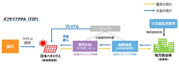 日本ベネックスは、3か所の太陽光発電所(宮城県岩沼市に1か所、千葉県千葉市に2か所の合計発電容量約10MW、DC)を建設してFIT制度で運用しています。今回、日本ベネックスは、これらの発電所をFITからFIP制度*1に切り替え、FIPを利用したコーポレートオフサイトPPA(電力販売契約)を締結します。FIPに切り替えた後に、東芝ESSが再エネBG*2を構成し、日本ベネックスが発電した再エネ電力を東芝ESSが固定価格で買い取り、国際航業に相対取引で売電します。国際航業は、本契約による再エネ電力を複数の地方自治体などに供給する予定です。