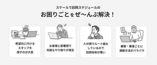 ScaLe(スケール)は、物流とは異なり、人がサービス提供しに出向く産業に対して、最適化AIによって最適な訪問計画を提示することで、「訪問スタッフの余剰稼働を減らす」また「スタッフ稼働効率を上げる」といった効果発揮を支援します。そして、お客様との日時確定までのリードタイムも大幅に短縮でき、離脱率の低下や、「顧客満足度の向上」にも貢献します。