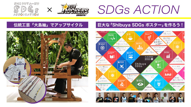 第一弾は奄美大島に拠点を構える有限会社はじめ商事(以下、はじめ商事)にも参画いただき、日本の伝統工芸でもある「大島紬」とコラボレーションして、使用できなくなったサンロッカーズ渋谷のユニフォーム等をアップサイクルし、オフィシャルグッズに生まれ変わらせます。第二弾は選手とファンのSDGsアクションを可視化した巨大「Shibuya SDGsポスター」を完成させます。