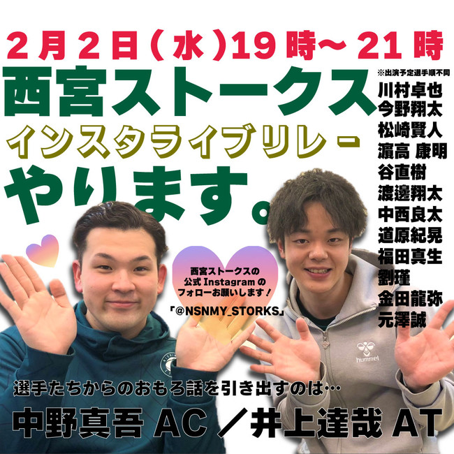 Bリーグ2部に所属する西宮ストークスは、新型コロナウイルス感染症拡大の影響を受けて中止となった、 ホーム香川ファイブアローズ戦の試合開始予定の同時刻の時間に2月2日(水)19:00より、 ストークスの選手たち14人によるインスタライブリレーを配信します。