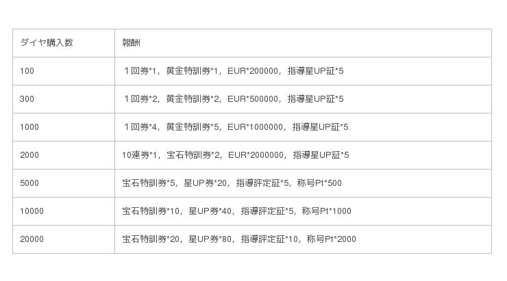 イベント期間中、ダイヤの単発購入数に応じて、各種豪華報酬が獲得できるお得なイベントです。