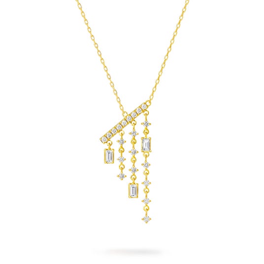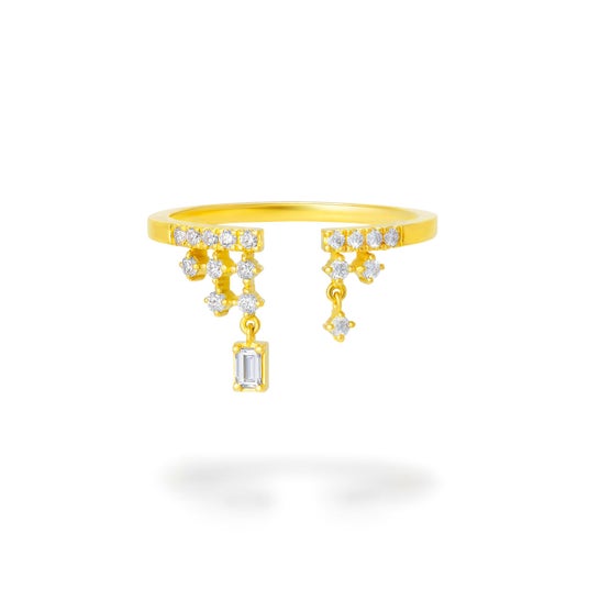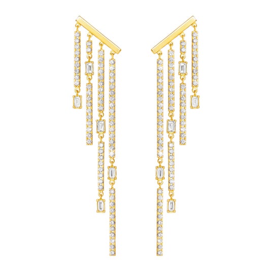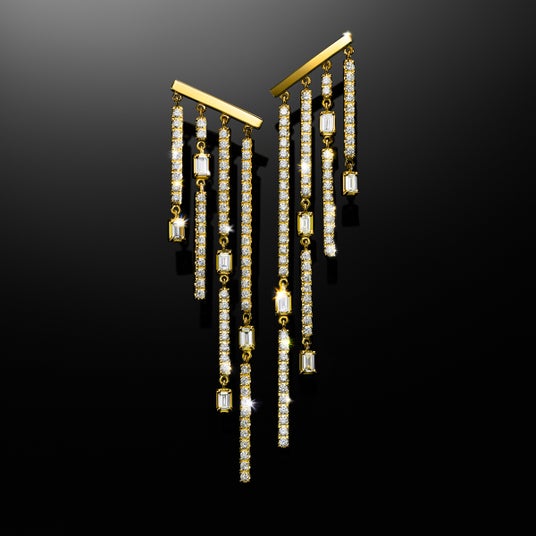 バゲットカットダイヤモンドとラウンドブリリアントカットダイヤモンドがまるで丁寧に織り上げられたシルクのように軽やかに優雅に煌めき、上品な輝きの余韻をもたらす「シャンデリア スウェイ」。ダイヤモンドのスレッドがしなやかに揺れるたびに凛とした表情を紡ぎ出し、スタイリングにモダンなエレガンスを添えます。