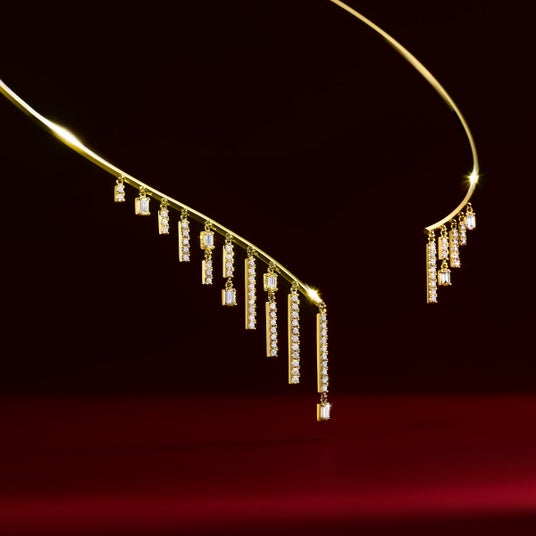 今シーズンのステートメントピースである「シャンデリア バゲットグラン」。バゲットカットダイヤモンドとイエローゴールドバーによって組み上げられたスレッドが、揺れるたびに繊細かつ大胆に優美な存在感を放つ、ラグジュアリーなファインジュエリーです。流れるような美しい曲線が作り出すオーガニックなシェイプが特徴のチョーカーは、緻密に計算されたクラフツマンシップが光る逸品。また、10ピースのバゲットカットダイヤモンドとゴールドバーが動きに呼応し、輝きが解き放たれる珠玉のピアス。洗練されたデザインと精緻なクラフツマンシップが、身に纏う方やその周囲を艶やかに魅了します。