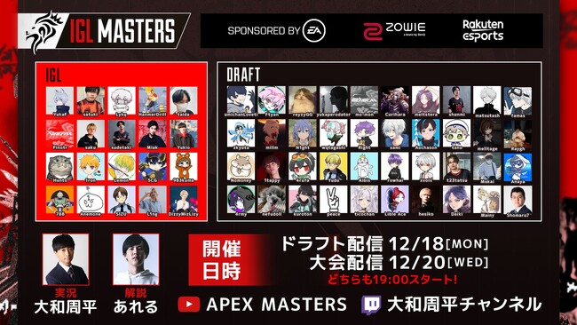 この度、株式会社RATEL(本社:福岡市中央区、代表:吉村 信平 https://ratel.games/ )は、株式会社ODYSSEY(本社 : 東京都大田区、代表取締役社長 : 平岩 康佑)が2023年12月20日に主催する、FPSゲーム「Apex Legends」におけるナンバーワンIGL(※1)を決めるeスポーツ大会「IGL MASTRES」のイベント制作・配信を担当する運びとなりました。