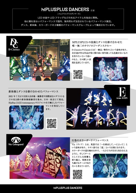 「MPLUSPLUS DANCERS」は異なるジャンルで活躍する3つのチームから構成されています。ダンサー5名から成る「D-Classics(C)(ディークラシックス)」、新体操とダンスの融合を追求する「team ECRiN(チームエクリン)」、そして、カラーガードパフォーマンスの専門家集団「Via Colorguard(ヴィアカラーガード)」の3組の集合体で昨年4月の結成お披露目公演で大きな反響を呼びましたが、今回は最新の開発アイテムを導入し、さらなる進化したステージを行います。