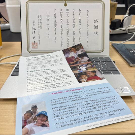このたび、JCVの事務局長および高橋様がスタンディングポイント本社に来社され、長年にわたるワクチン寄付活動への感謝状を代表して受領いたしました。