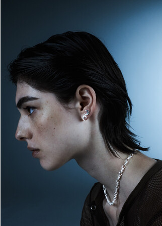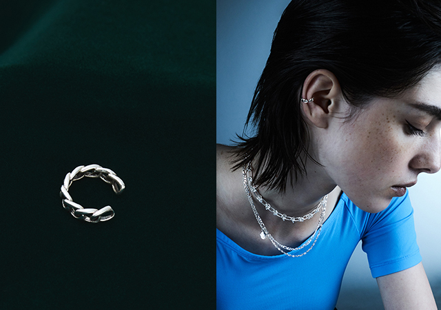 抜けのあるシルバーチェーンが光を反射して、エッジィでモダンな横顔を演出します。