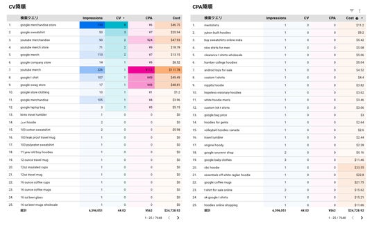 そして今回新たに作成した「Google広告版Looker Studio検索クエリパフォーマンス分析用テンプレート」では、検索クエリごとの詳細なパフォーマンスを簡単に把握することが可能です。
