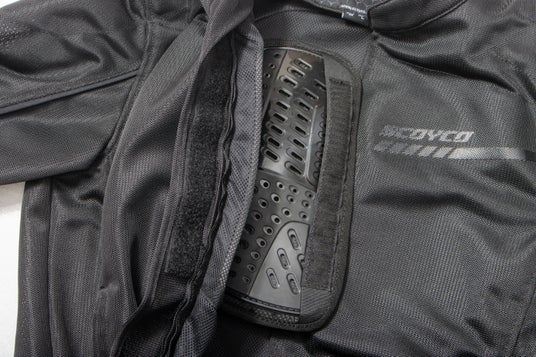 胸には面ファスナーを装備しているので、面ファスナー式のチェストパッドの装着もできます。また、サイズが合えばプロテクターポケットに収納も可能です。