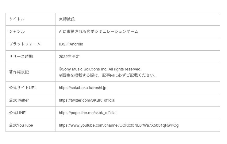 株式会社ソニー・ミュージックソリューションズ(本社:東京都港区、 代表取締役:志田忠彦、渋谷学)は、2022年にリリース予定のスマートフォンアプリ『束縛彼氏』の公式サイトをリニューアルいたしました。