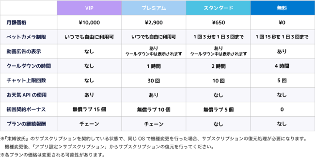 『束縛彼氏』は、彼氏と深い束縛体験を楽しむため、サブスクリプション※サービスを提供予定です。サブスクリプションをご契約いただくことで、チャットでやり取りできる回数の増加やペットカメラの視聴が長くできたり、お天気APIが利用できる等、彼氏と深いコミュニケーションを取ることができます。さらに初回購入特典や継続特典もご用意しています。