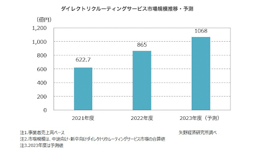 株式会社矢野経済研究所の調査によれば、ダイレクトリクルーティング市場は 2021年622.7億円から2023年には1068億円に増加し、右肩上がりに伸びています。