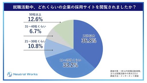 また、株式会社ニュートラルワークスの調査によれば、就職活動中どの程度企業の採用サイトを参照したかというと問いに対して、多い方で50社以上企業の「企業の採用サイト」を訪問し、選考フローに移る流れになっていることが分かります。