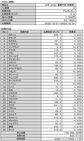 全32選択肢のうち最も多かった投票内容は、「ブラジル」の優勝、払戻倍率(オッズ)は2.6倍となった中、5番目に投票の多かった結果となりました。