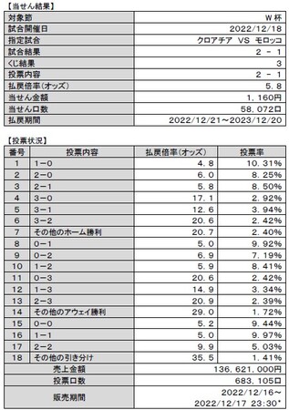 ・3位決定戦「クロアチア vs モロッコ」の対戦は、2-1でクロアチアの勝利となり、払戻倍率(オッズ)は5.8倍、当せん金額は1,160円となりました。