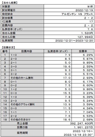 ・決勝「アルゼンチン vs フランス」の対戦は、2-2で引き分けとなり、払戻倍率(オッズ)は7.6倍、当せん金額は1,520円となりました。