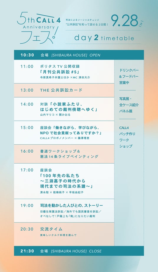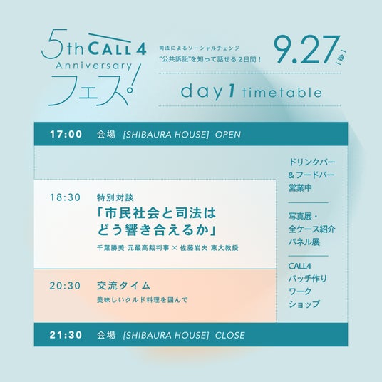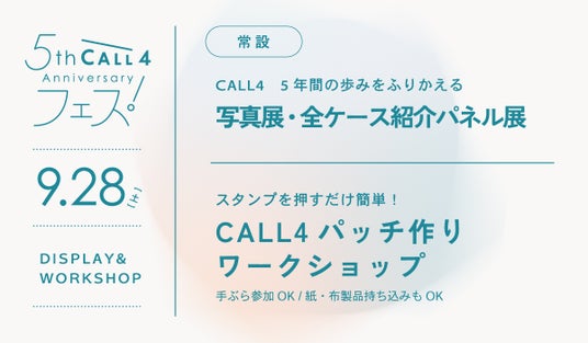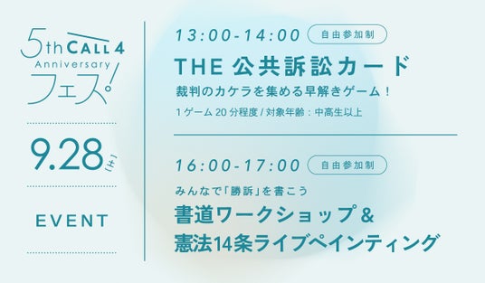 日本初(※1)の公共訴訟支援に特化したウェブプラットフォームCALL4(コールフォー)(運営:認定特定非営利活動法人CALL4、共同代表理事:谷口太規、丸山央里絵)は、正式リリース5周年を記念して9月27日(金)・28日(土)に東京で「CALL4フェス!」を開催いたします(11月には関西開催を予定)。