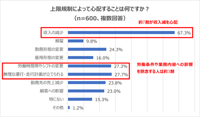 「時間外労働の上限規制によって心配していることは何か」の質問に対し回答は、最多が「収入の減少」67.3%、次いで「無理な運行・走行計画が立てられる」27.7%、「労働時間帯やシフトの変更」が27.3%で、労働条件や業務内容への影響を懸念する回答が多かった。