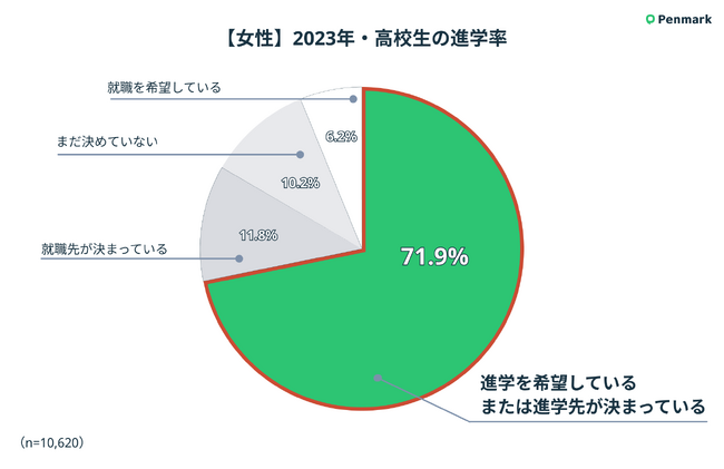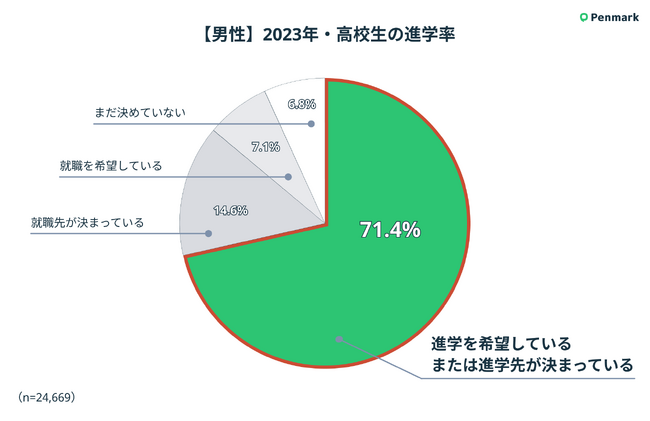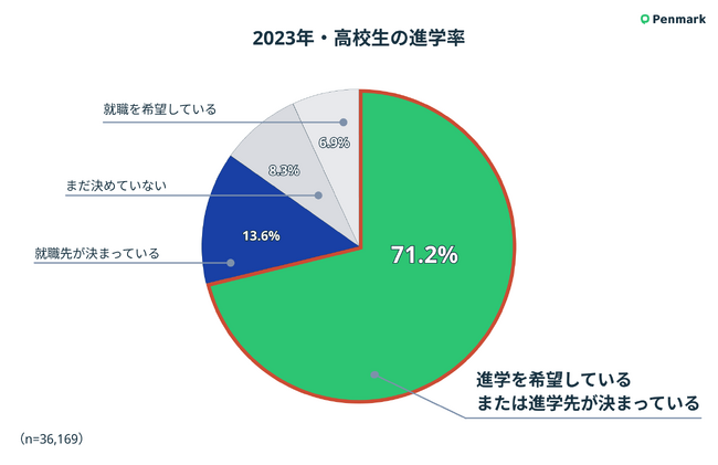 高校生の高等教育機関への進学希望率は71.2%となった(2023年2月時点)。昨年の文部科学省のデータ(2022年5月時点)では、高等教育機関への進学率は過去最高の83.8%となり、受験シーズンの2月から3月にかけて進学を選択する学生が増える傾向が伺えた。