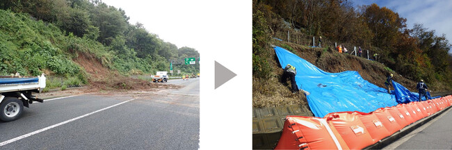 (左)災害発生時 (右)ハイウェイデルタを設置し復旧 ※写真はイメージ