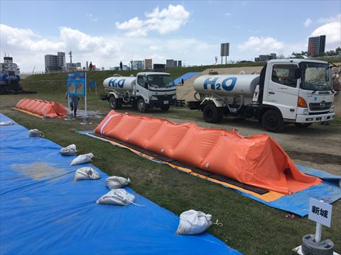 太陽工業では、街中から河川沿い、いざという時のために幅広い水害対策器材を開発、製造、販売しています。「ハイウェイデルタ」は、土のうに代わる水防ツール「デルタチューブ(下写真)」を応用して開発した道路災害対策の新製品です。