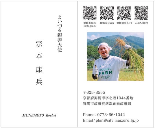 宗本さんと南野さんは、2022年(令和4年)から毎年、舞鶴市室牛(むろじ)地区での米作りに参加いただき、地域の皆様との交流を深められ、2023年(令和5年)9月には、舞鶴をイメージした楽曲「飛揚−Hiyoh−~再会の似合うまち舞鶴~」を共同制作し舞鶴市に寄贈いただくなど、本市との深い縁を持たれております。