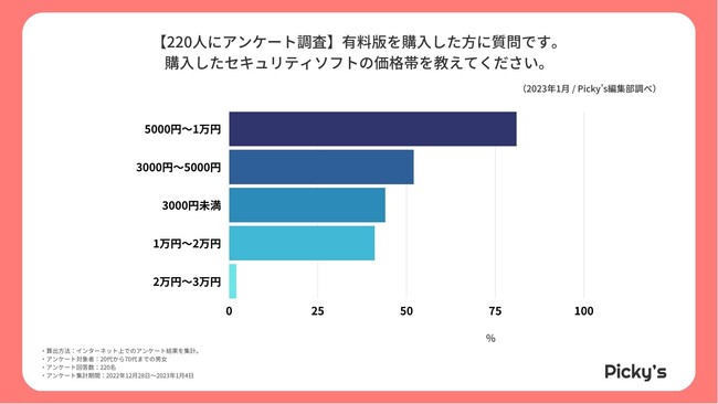 1位は5000円~1万円、2位は3000円~5000円、3位は3000円未満と、1万円以内でセキュリティソフトを導入する方が多いようです。