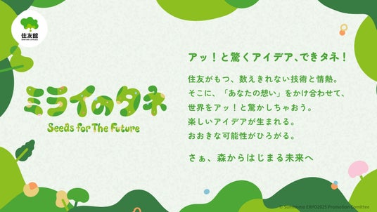 「住友グループの数えきれない技術や取組み」をもとに、人類が直面する共通課題の解決や豊かな未来社会づくりへの想いを込めて創出されたアイデアを「ミライのタネ」と名付けられました。人々によってつくり出された「ミライのタネ」が世界中に広がり、いつか芽を出して大きく成長することで、課題解決や豊かな未来社会の実現へとつながっていくことを目指しています。