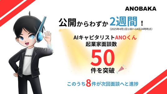 シード特化のベンチャーキャピタル株式会社ANOBAKA(本社:東京都港区、代表取締役:長野 泰和)は、2025年4月1日にリリースしたAIキャピタリスト「ANOくん」が、ローンチからわずか2週間で50件を超える面談利用を達成したことをお知らせいたします。
