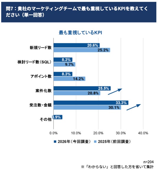 2026年の活動において重視するKPIに大きな変化が見られました。長らく最重要視されていた「新規リード獲得数」の比重が下がり、代わって「案件化数」や「受注数・受注金額」を重視する企業が増加しています。マーケティング部門に対し、単なる見込み客の「量」ではなく、事業収益に直結する「質」への貢献がよりシビアに求められるフェーズに入りました。